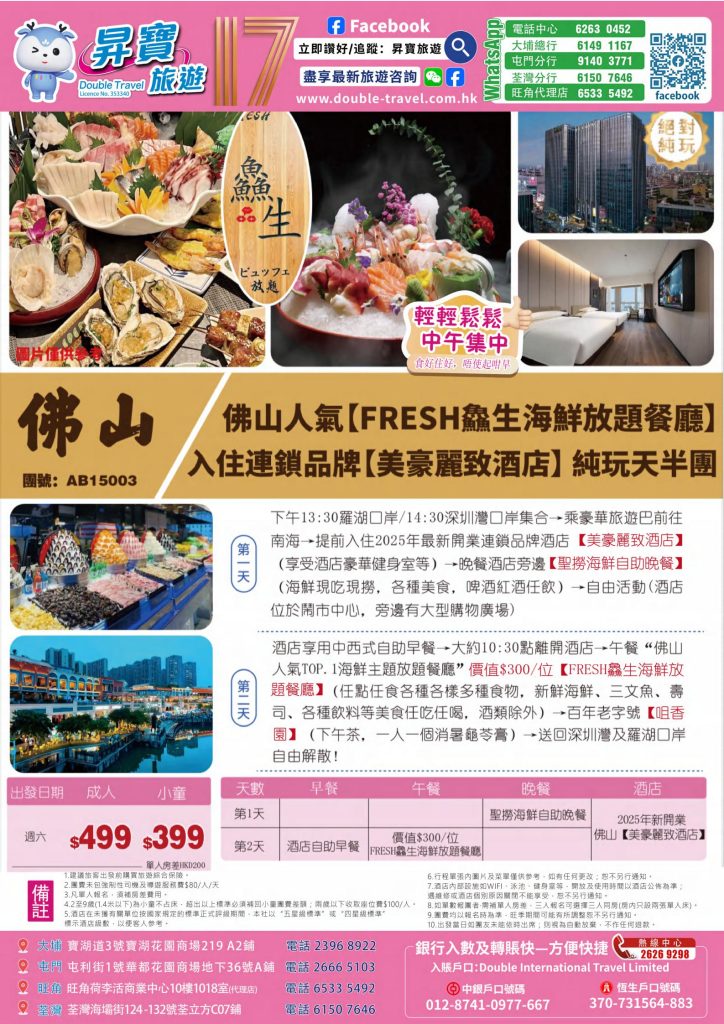 Home 廣東省短線系列 天半團系列 AB15003 佛山 Fresh 純玩天半團 🔍 AB15003 佛山 Fresh 純玩天半團 WishlistWishlist 分類: 天半團系列 Share your love 描述 相關商品 Quick view icon ABP20018重新裝修東莞【厚街富盈酒店】純玩兩天團(下午出發) 廣東省短線系列, 天半團系列查看內容 Quick view icon AB15006 深圳 登喜路酒店 純玩天半團 天半團系列, 本月精選推介查看內容 Quick view icon AB15016廣州“番尋味”-番禺四海一家自助餐+中山東鳳大信兩天團(下午) 廣東省短線系列, 天半團系列查看內容 Quick view icon ABP20019惠陽五星裕華鉑金酒店天半团 兩天團 (中午出發), 廣東省短線系列, 天半團系列查看內容