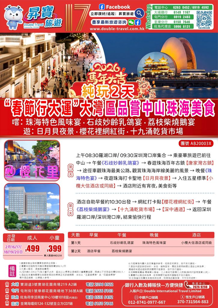 Home 節日推介 節日短線 AB20003X 中山珠海美食-純玩兩天團 🔍 AB20003X 中山珠海美食-純玩兩天團 WishlistWishlist 分類: 節日短線 Share your love 描述 相關商品 Quick view icon ABP20006X 深圳寶安希爾頓逸林酒店兩天團 (中午出發) 節日短線查看內容 Quick view icon AB30001X 臺山佛山三天行大運(2月16-20日出發) 節日短線查看內容 Quick view icon AB30004X 佛山南海影視城+祖廟三天團(2月16-20日出發) 節日短線查看內容 Quick view icon ABP30008X 東莞錦福國際酒店+雙月灣君廷酒店純玩三天團(中午出發) 節日短線查看內容