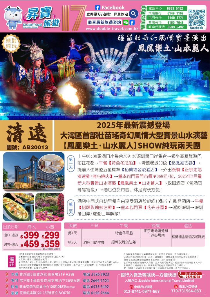 Home 廣東省短線系列 兩天團系列 兩天團 (早上出發) AB20013 清遠 山水麗人兩天團 🔍 AB20013 清遠 山水麗人兩天團 WishlistWishlist 分類: 兩天團 (早上出發) Share your love 描述 相關商品 Quick view icon AB20010 珠海 江門 純玩兩天團 兩天團 (早上出發)查看內容 Quick view icon AB20043【年貨團】珠海中山美食純玩兩天團 兩天團 (早上出發), 本月精選推介查看內容 Quick view icon AB20036 惠東 雙月灣君廷酒店 純玩兩天團 兩天團 (早上出發)查看內容 Quick view icon AB20035 龍門 竹溪山溫泉 純玩兩天團 兩天團 (早上出發)查看內容