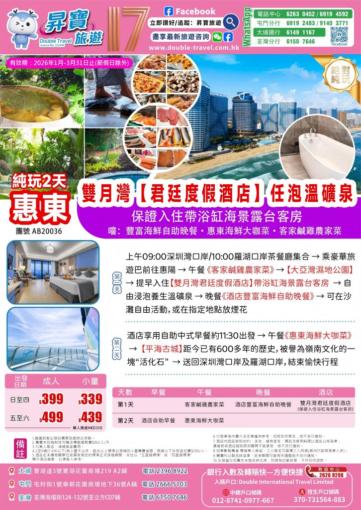 Home 廣東省短線系列 兩天團系列 兩天團 (早上出發) AB20036 惠東雙月灣君廷酒店 純玩 兩天團 🔍 AB20036 惠東雙月灣君廷酒店 純玩 兩天團 WishlistWishlist 分類: 兩天團 (早上出發) Share your love 描述 相關商品 Quick view icon AB20040 惠東雙月灣君廷酒店+華家班汽車特技表演兩天團 兩天團 (早上出發)查看內容 Quick view icon QB20001 廣州<銘門盛宴>兩天團【甘肅青海 直航8天 線路推介會】 兩天團 (早上出發), 本月精選推介, 快閃優惠查看內容 Quick view icon AB15010 廣州 佛山 純玩 兩天團 兩天團 (早上出發)查看內容 Quick view icon AB20035 龍門 竹溪山溫泉 純玩兩天團 兩天團 (早上出發)查看內容