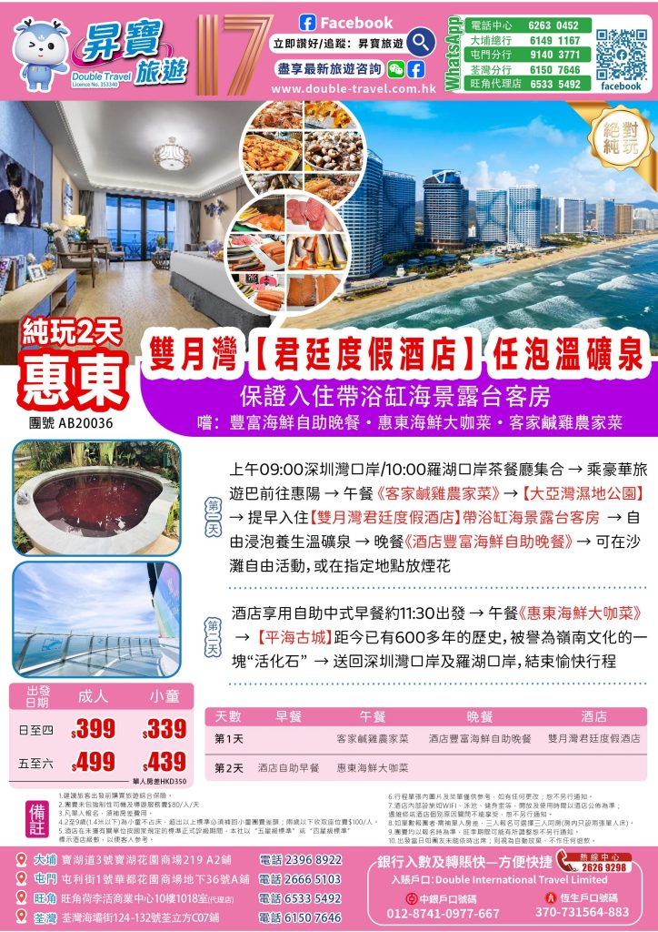 AB20036 惠東 雙月灣君廷酒店 純玩兩天團