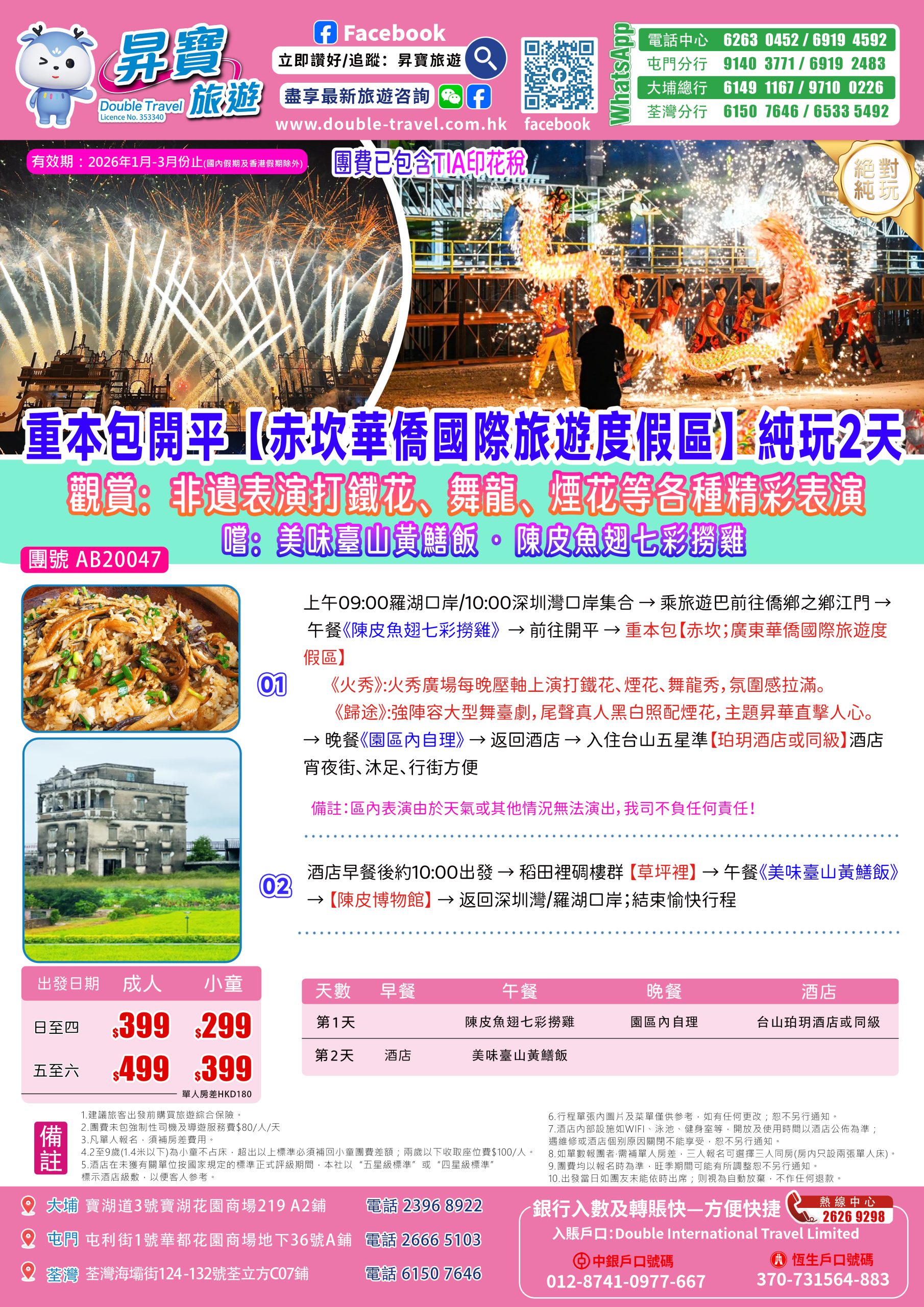 Home 廣東省短線系列 AB20047赤坎古鎮純玩兩天團(住台山珀玥酒店) 🔍 AB20047赤坎古鎮純玩兩天團(住台山珀玥酒店) WishlistWishlist 分類: 兩天團 (早上出發), 廣東省短線系列, 兩天團系列 Share your love 描述 相關商品 Quick view icon AB20019 中山 傳統三大美食兩天團 兩天團 (早上出發)查看內容 Quick view icon ABP20018重新裝修東莞【厚街富盈酒店】純玩兩天團(下午出發) 廣東省短線系列, 天半團系列查看內容 Quick view icon AB20036 惠東雙月灣君廷酒店 純玩 兩天團 兩天團 (早上出發)查看內容 Quick view icon ABP20021東莞常平翔盈國際玩兩天團(下午出發) 廣東省短線系列, 天半團系列查看內容