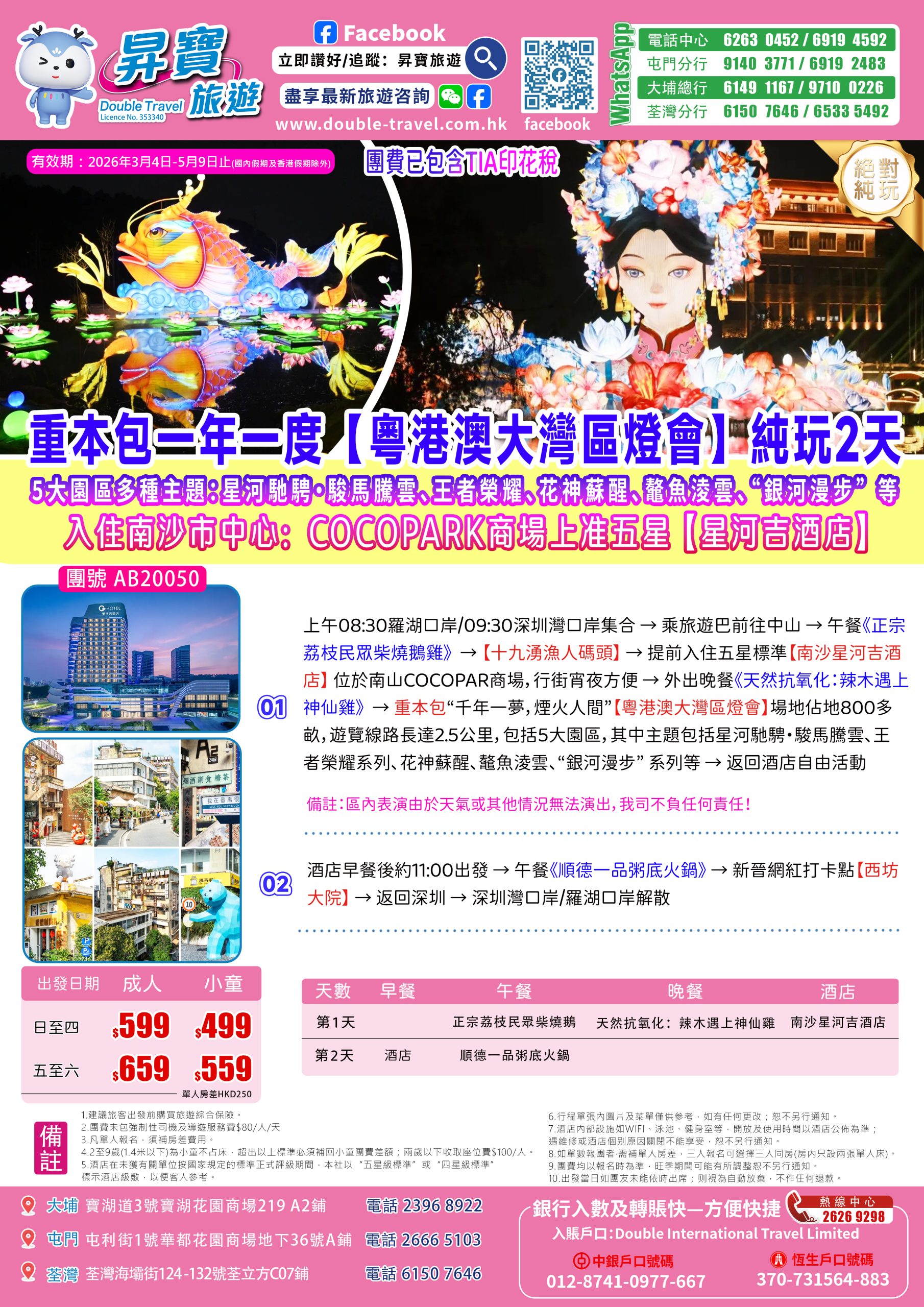 Home 廣東省短線系列 AB20050重本包一年一度大灣區燈會純玩兩天團 🔍 AB20050重本包一年一度大灣區燈會純玩兩天團 WishlistWishlist 分類: 兩天團 (早上出發), 廣東省短線系列, 兩天團系列 Share your love 描述 相關商品 Quick view icon ABP20018重新裝修東莞【厚街富盈酒店】純玩兩天團(下午出發) 廣東省短線系列, 天半團系列查看內容 Quick view icon AB20035 龍門 竹溪山溫泉 純玩兩天團 兩天團 (早上出發)查看內容 Quick view icon AB20035A 龍門竹溪山境溫泉酒店 兩天團 兩天團 (早上出發)查看內容 Quick view icon AB20019 中山 傳統三大美食兩天團 兩天團 (早上出發)查看內容