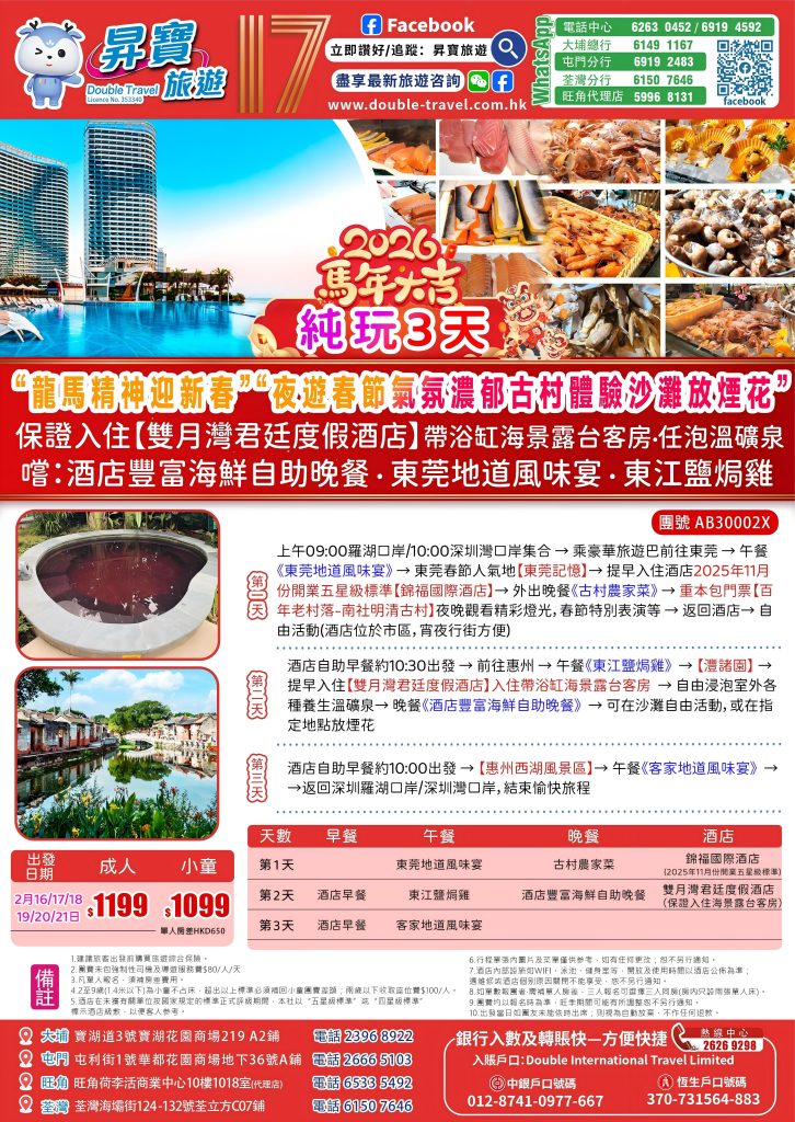 Home 節日推介 節日短線 AB30002X 東莞錦福國際登酒店+雙月灣君廷酒店純玩三天團(2月16-20日出發) 🔍 AB30002X 東莞錦福國際登酒店+雙月灣君廷酒店純玩三天團(2月16-20日出發) WishlistWishlist 分類: 節日短線 Share your love 描述 相關商品 Quick view icon AB30003X 康泉雲海溫泉+深圳希爾頓酒店(2月16-20日出發) 節日短線查看內容 Quick view icon AB30005X 清遠美林國際酒店+厚街富盈酒店 – 純玩三天團 節日短線查看內容 Quick view icon AB20001X 惠東雙月灣君廷酒店純玩兩天團 節日短線查看內容 Quick view icon ABP30009X 佛山南海影視城+祖廟三天團(中午出發) 節日短線查看內容