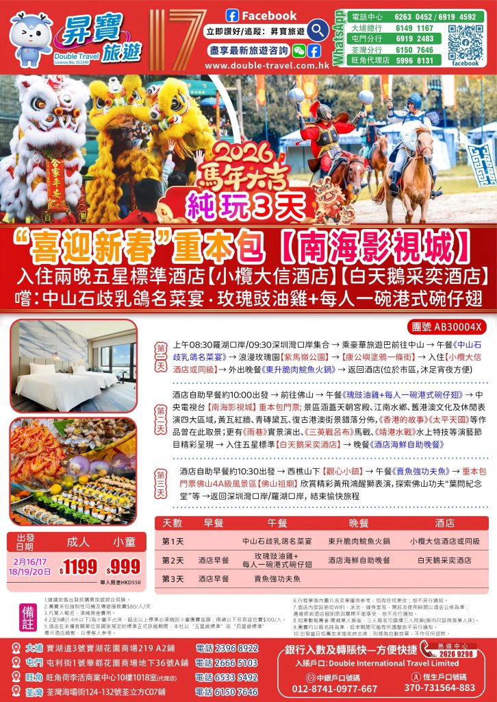 Home 節日推介 節日短線 AB30004X 佛山南海影視城+祖廟三天團(2月16-20日出發) 🔍 AB30004X 佛山南海影視城+祖廟三天團(2月16-20日出發) WishlistWishlist 分類: 節日短線 Share your love 描述 相關商品 Quick view icon AB20001X 惠東雙月灣君廷酒店純玩兩天團 節日短線查看內容 Quick view icon ABP30009X 佛山南海影視城+祖廟三天團(中午出發) 節日短線查看內容 Quick view icon AB30005X 清遠美林國際酒店+厚街富盈酒店 – 純玩三天團 節日短線查看內容 Quick view icon AB20002X 赤坎古鎮純玩兩天團 節日短線查看內容