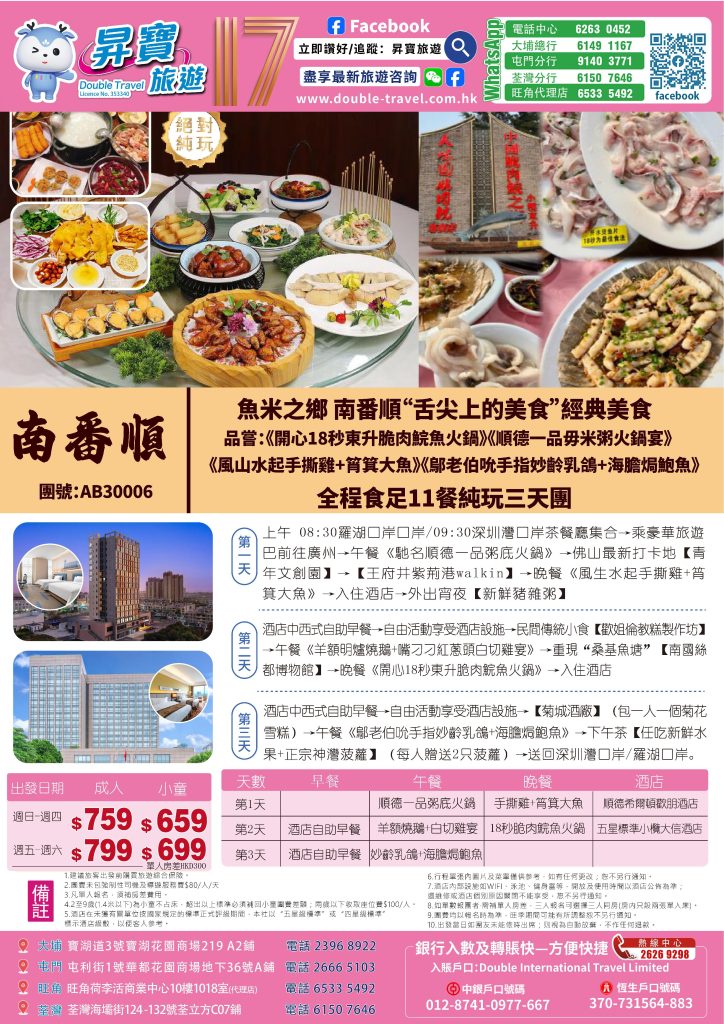 Home 廣東省短線系列 三,四天團系列 AB30006 南番 順魚米之鄉 純玩三天團