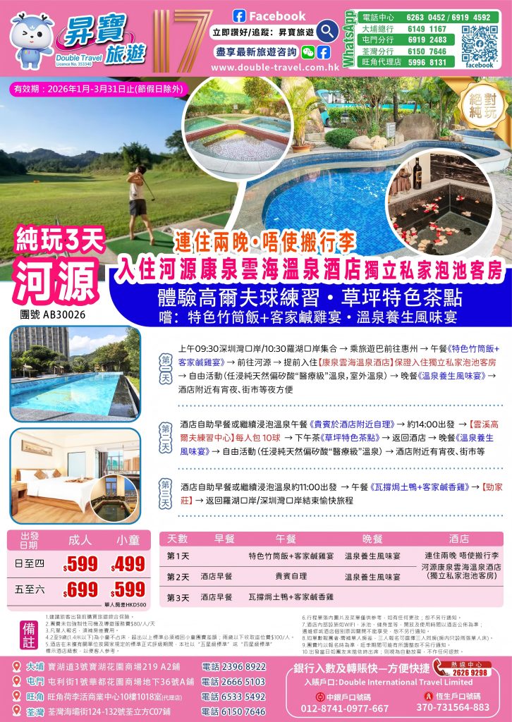 Home 廣東省短線系列 三,四天團系列 AB30026 連住兩晚河源-康泉雲海溫泉酒店 纯玩三天團 🔍 AB30026 連住兩晚河源-康泉雲海溫泉酒店 纯玩三天團 WishlistWishlist 分類: 三,四天團系列 Share your love 描述 相關商品 Quick view icon AB30006 南番 順魚米之鄉 純玩三天團 三,四天團系列查看內容 Quick view icon AB30019 龍門 美泉谷溫泉 純玩三天團 三,四天團系列查看內容 Quick view icon AB30029韶關巴士重本包丹霞山竹筏遊船純玩3天 三,四天團系列查看內容 Quick view icon AB30008 廣州 珠江夜遊+融創大馬戲 純玩三天團 三,四天團系列查看內容