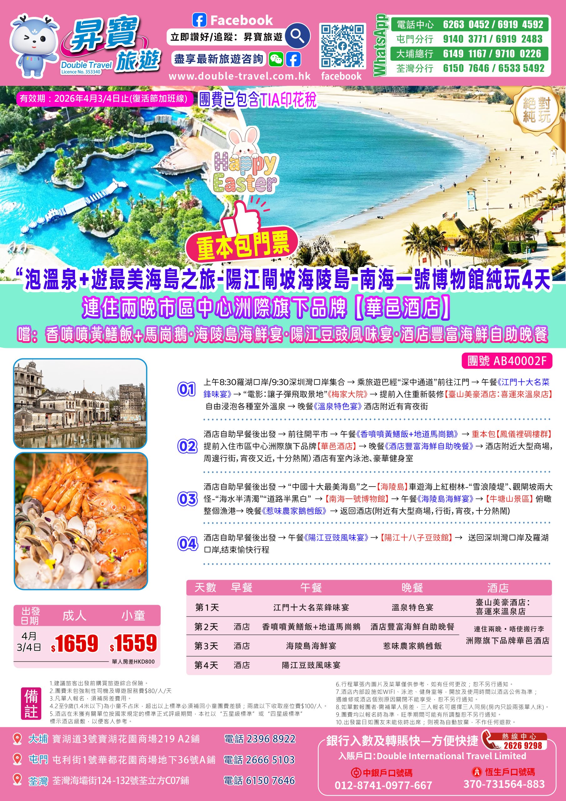 Home 節日推介 節日短線 AB40002F泡珍稀溫泉,遊最美岛屿-海陵島+入住市區中心華邑酒店-巴士4天 AB40002F泡珍稀溫泉,遊最美岛屿-海陵島+入住市區中心華邑酒店-巴士4天 WishlistWishlist 分類: 節日短線, 節日推介 Share your love 描述 相關商品 Quick view icon AB20001F東莞隱賢山莊酒店兩天團 節日短線, 節日推介查看內容 Quick view icon ABP30001F南海瞻雲+大灣區燈會純玩三天(下午出發) 節日短線, 節日推介查看內容 Quick view icon AB30003F龍門美泉谷嘉華度假+君源鉑爾曼三天 節日短線, 節日推介查看內容 Quick view icon ABP20001F食好住好九江源林酒店美食兩天團 節日短線, 節日推介查看內容