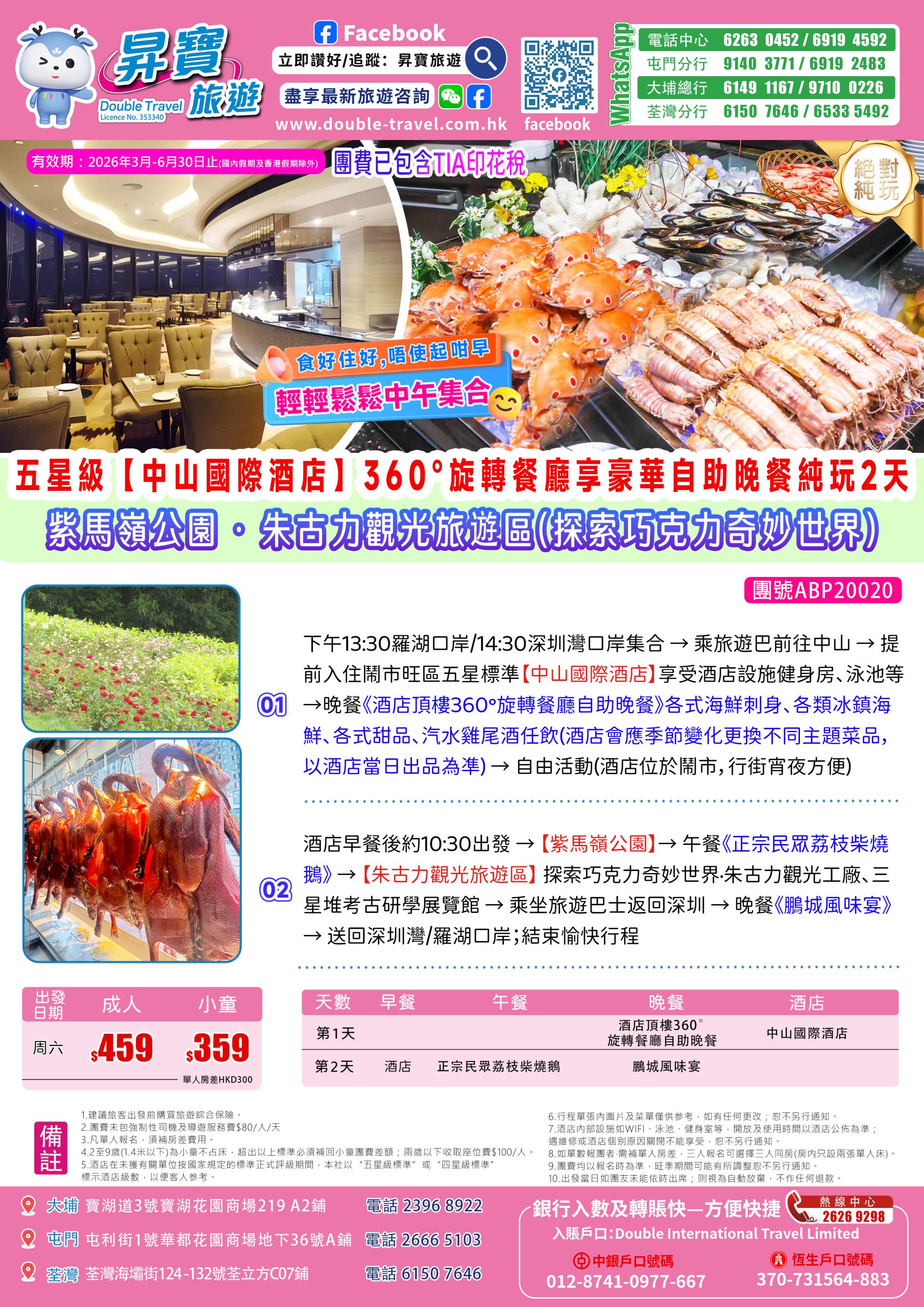 Home 廣東省短線系列 ABP20020中山國際酒店-360°旋轉餐廳自助晚餐純玩兩天團 🔍 ABP20020中山國際酒店-360°旋轉餐廳自助晚餐純玩兩天團 WishlistWishlist 分類: 廣東省短線系列, 天半團系列 Share your love 描述 相關商品 Quick view icon AB20050重本包一年一度大灣區燈會純玩兩天團 兩天團 (早上出發), 廣東省短線系列, 兩天團系列查看內容 Quick view icon AB20047赤坎古鎮純玩兩天團(住台山珀玥酒店) 兩天團 (早上出發), 廣東省短線系列, 兩天團系列查看內容 Quick view icon ABP20021東莞常平翔盈國際玩兩天團(下午出發) 廣東省短線系列, 天半團系列查看內容 Quick view icon AB20051廣州“番尋味”-番禺四海一家自助餐+大瀝美豪麗致兩天團(買三送一) 兩天團 (早上出發), 廣東省短線系列, 兩天團系列, 本月精選推介查看內容