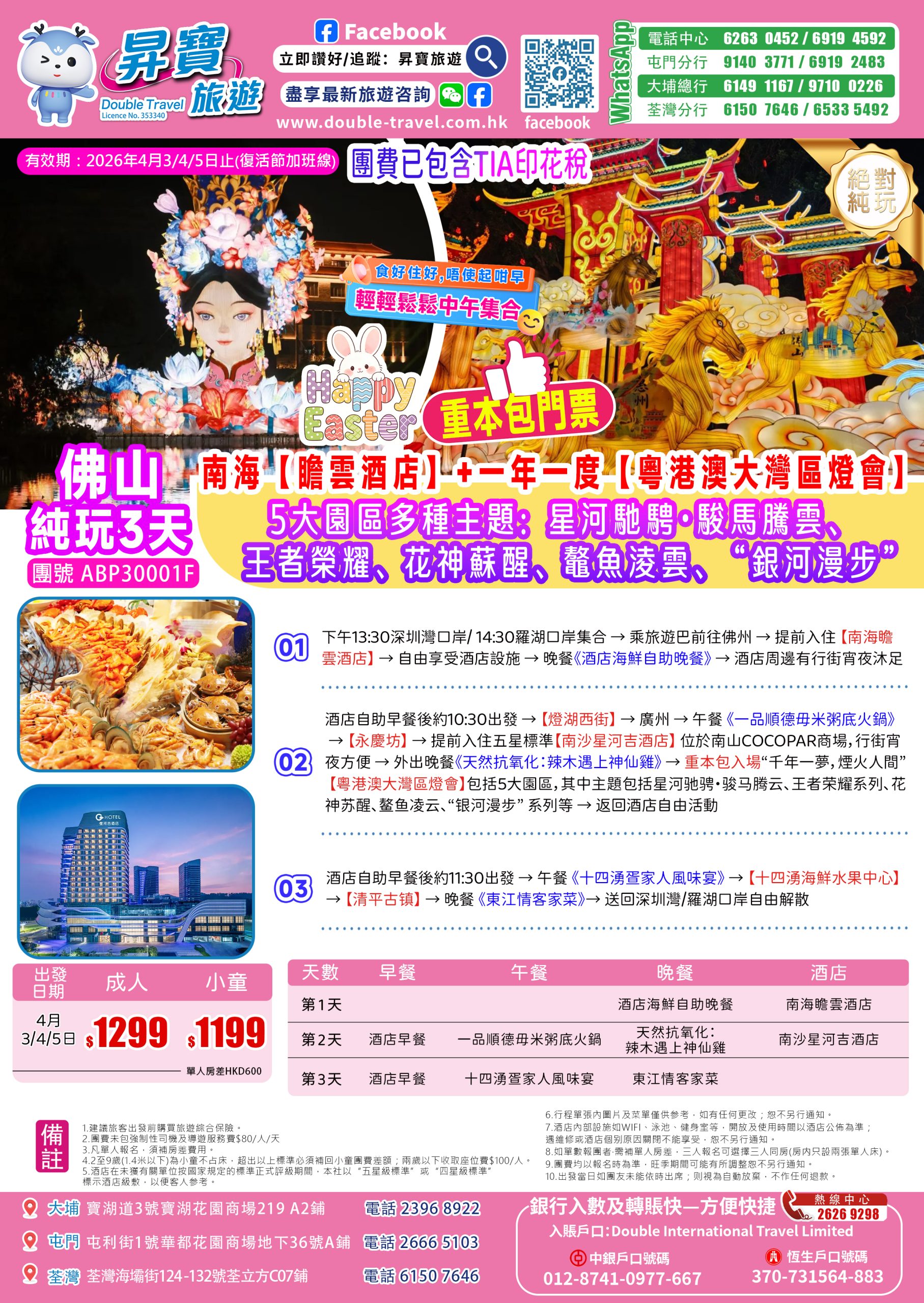Home 節日推介 ABP30001F南海瞻雲+大灣區燈會純玩三天(下午出發) 🔍 ABP30001F南海瞻雲+大灣區燈會純玩三天(下午出發) WishlistWishlist 分類: 節日短線, 節日推介 Share your love 描述 相關商品 Quick view icon ABP20001F食好住好九江源林酒店美食兩天團 節日短線, 節日推介查看內容 Quick view icon AB30005F河源萬綠湖+惠州皇冠假日纯玩3天團 節日短線, 節日推介查看內容 Quick view icon AB30001F珠海美食+澳門水舞間純玩3天 節日短線, 節日推介查看內容 Quick view icon ABP20003F惠陽麗澤國際酒店純玩兩天團(下午出發) 節日短線, 節日推介查看內容